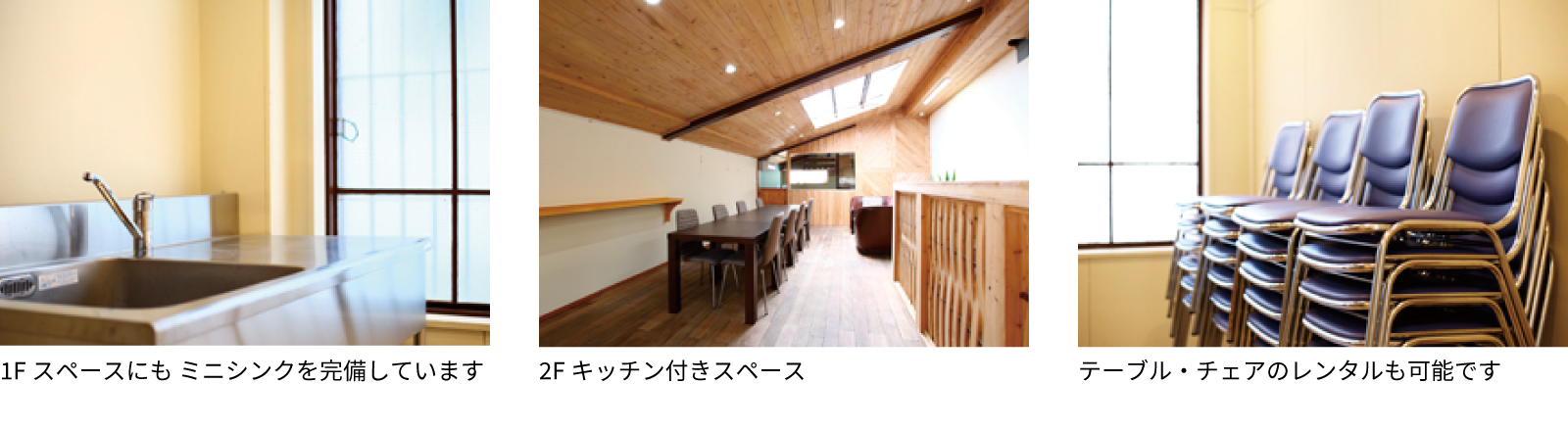 大テーブル(W2100×D600×H700)2卓、会議テーブル(W1800×D600×H700)4卓、スタッキングチェア 30脚 はレンタル可能です。基本的に無料でお使いいただけますが、破損・紛失の場合はお客様にご負担いただくこともございます。